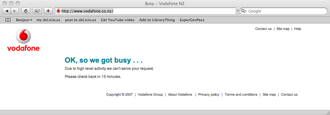 I wasn’t sure whether to contact Apple (expecting a “please call Vodafone” answer) or Vodafone (expecting a “what do you mean you updated your phone? Can you do that?” answer). Thankfully, Vodafone NZ has a very responsive and helpful Twitter presence (@vodafoneNZ). I tweeted, asking who to call, and was asked for details. I provided these (going into more detail in an email), and got back a (unfortunately not helpful at all) suggestion. Since that didn’t work, Paul Brislen provided me with an 0800 number for the “iPhone Team” (I’d call them “iTeam”, subtitled “there’s an ‘i’ in iTeam”, but anyway…). Unfortunately, since I had to do a lot of travelling and offline things on Monday, I wasn’t able to get to this until Tuesday.